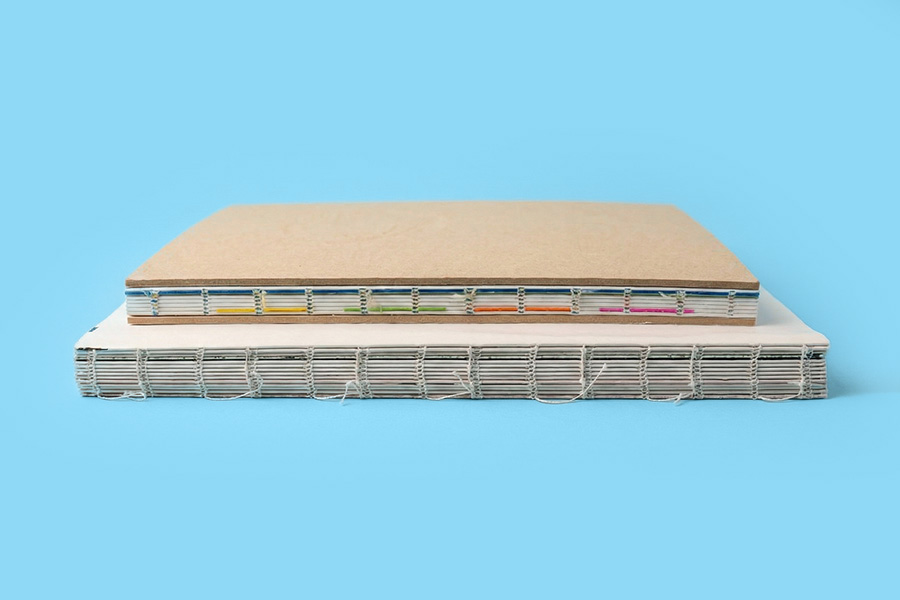 Cartón rígido con acabados en tela, piel sintética o texturizados.